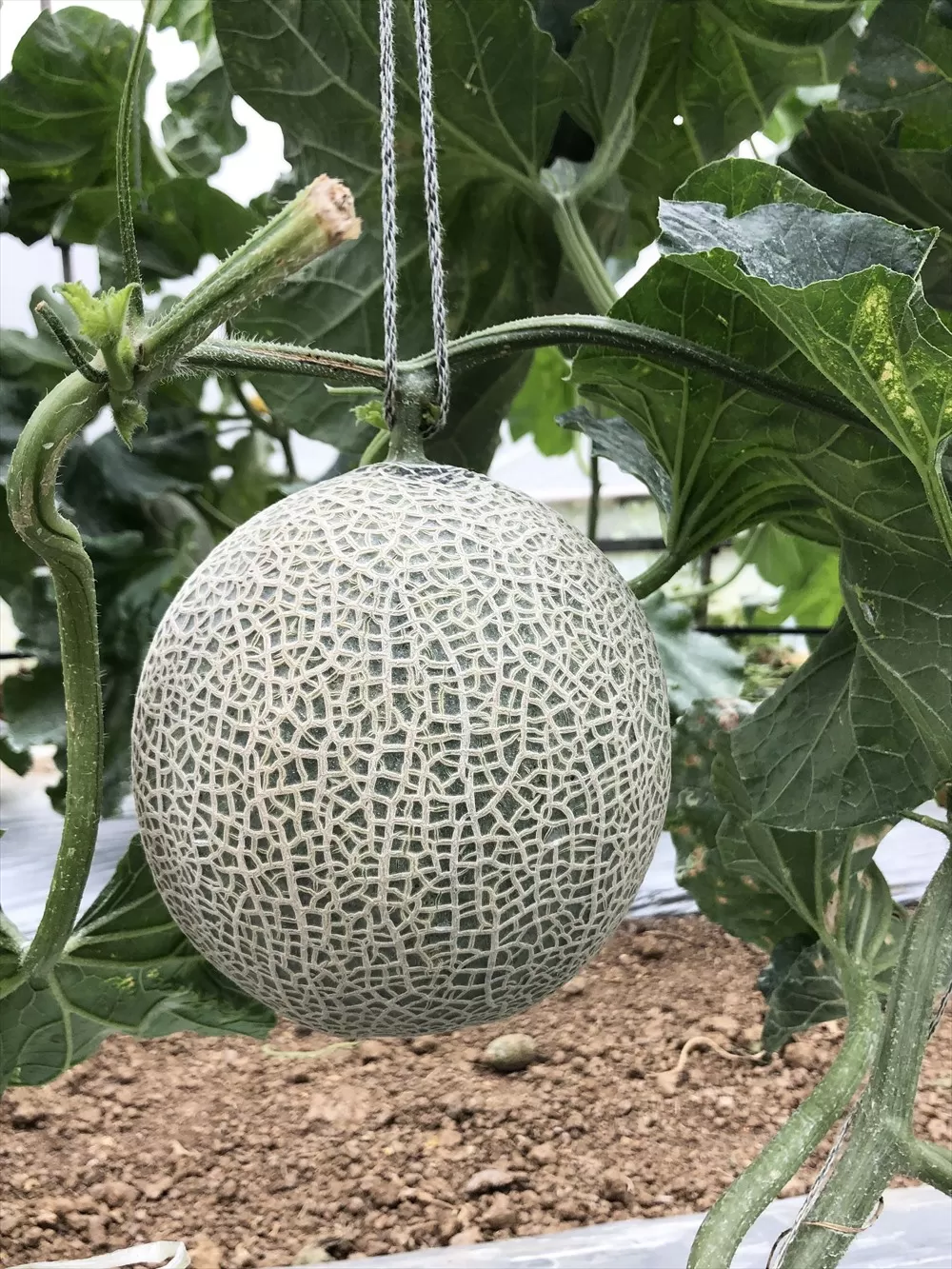 一つの枝に一つのメロン。一枝一果の栽培方法で、美味しさだけではなく、美しい網目も実現。