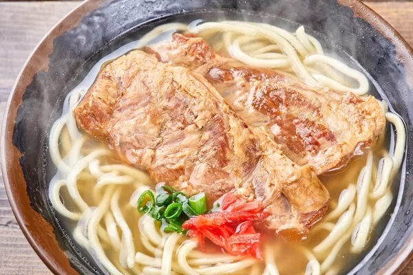 ソーキそばとは、沖縄そばのひとつで、豚の骨付きあばら肉(スペアリブ)が乗ったそばのことです。ソーキには「本ソーキ」と軟骨部分を使った「軟骨ソーキ」があり、宮良そばのソーキは「本ソーキ」です。食べ応えのあるお肉が特徴です。