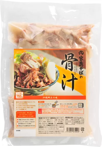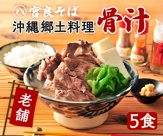 骨付き肉たっぷり・沖縄郷土料理『骨汁』5食|沖縄そばの老舗【宮良そば】 この商品の収穫・発送時期 基本通年 【老舗】宮良そばの骨汁沖縄県民に愛される骨汁とは?沖縄のソウルフードであり、沖縄そばの出汁を作る際の骨付き肉を使って、アレンジした郷土料理です。黄金色の出汁にお肉のついた骨をどっさり乗せて、そこに豆腐や青菜を添えていただきます。絶品スープの秘密とは?長い年月をかけてたどり着いた絶品スープは、豚骨の出汁骨、カツオ出汁、昆布、野菜出汁を6時間以上かけて優しく炊いた黄金スープ。あっさりなのにコクと旨味がたっぷりで、胃に沁みわたります。ホロホロお肉をいただきます骨汁は骨を食べるわけではなく、骨の周りについた柔らかいお肉をいただく料理です。6時間も炊いてあるので、ホロホロになったとっても柔らかいお肉はお箸でスルリと骨から外れます。弱火でコトコト炊いてあるので、お肉の旨味がしっかり残っています。こんな方にオススメ!□ 絶品な沖縄郷土料理を試してみたい方□ 長い年月をかけてたどり着いた豚骨あっさり出汁を試してみたい方□ 沖縄県民だが、まだ食べたこと無い方五臓六腑の満足度100パーセント!ぜひ一度ご賞味ください宮良そばについて昭和61年創業の沖縄・那覇と浦添に店舗展開をしている、老舗・沖縄そば専門店です。代表メニューの「八重山そば」をはじめ、「骨汁」、「ソーキそば」や「てびちそば」、各種「定食」など、豊富なメニューと美味しさが人気のお店です。ネット通販では、沖縄以外ではなかなか食べられない思い出の味を、お店の美味しさそのままに全国各地にお届けして、沖縄県民又は沖縄ファンの皆さんに喜んで貰いたい!という強い思いから積極的に取り組んでいます。実際の店舗での骨汁を食べる様子はこちらhttps://youtube.com/shorts/wXSq-nygPC0?feature=share お客様の感想 まだありません お客様感想一覧へ 関連商品 ソーキそば 2食セット(出汁が染込んだソーキが美味しい) ¥5,400円(税込) 詳細ページへ 【大人の贅沢アグー豚パイとんBBQセット】味にこだわるBBQならアグー豚パイとん ¥9,400円(税込) 詳細ページへ 沖縄県産 車海老 BBQ用 特大 500g|久米島産 ¥7,100円(税込) 詳細ページへ 沖縄県産 高品質アーサ(あおさ)40g 乾燥|久米島 ¥1,400円(税込) 詳細ページへ アグー豚パイとん100%・生ハンバーグ150g 6個入り ¥5,700円(税込) 詳細ページへ